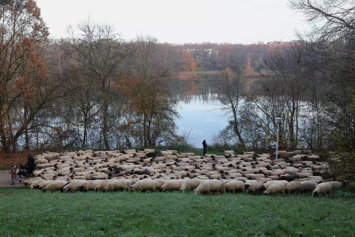 Sheep pass by the Wöhrder See on their way to the winter pastures, in Nuremberg, Germany, Sunday, Nov. 16, 2025. (Daniel Löb/dpa via AP)