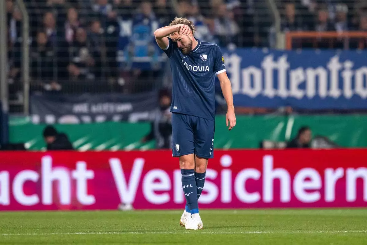 Bochum's Philipp Strompf reacts after scoring an own goal during the German soccer cup round of sixteen match beween VfL Bochum and VfB Stuttgart in Bochum, Germany, Wednesday, Dec. 3, 2025. (David Inderlied/dpa via AP)