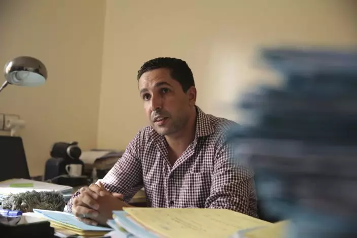 In this photo dated Wednesday, Aug. 29, 2018, Ibrahim Hashane, the lawyer of a 17-year-old Moroccan girl who told police she was gang-raped, forcibly tattooed and held against her will for two months, speaks during an interview with the Associated Press at her home in Oulad Ayad, near Beni Melal, central Morocco. Hashane says authorities have arrested 12 suspects in a case that's sparking fresh public outcry over women's rights and sexual abuse in the North African kingdom. The Moroccan government has so far declined to comment on the girl's harrowing account, but local police confirmed to The Associated Press that there have been arrests in the case, but wouldn't say how many or give details. (AP PhotoMosa'ab Elshamy)