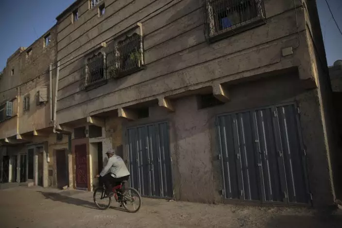In this photo dated Wednesday, Aug. 29, 2018, a man cycles past the neighborhood of a 17-year-old Moroccan girl, who told police she was gang-raped, forcibly tattooed and held against her will for two months, in Oulad Ayad near Beni Melal, central Morocco. The Moroccan government has so far declined to comment on the girl's harrowing account. Local police confirmed to The Associated Press that there have been arrests in the case, but wouldn't say how many or give details.(AP PhotoMosa'ab Elshamy)