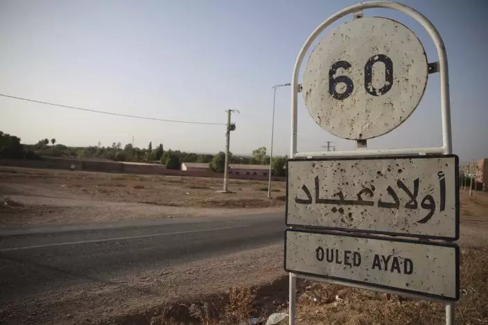 This photo dated Wednesday, Aug. 29, 2018 shows a street sign outside the town of Oulad Ayad, near Beni Melal, central Morocco where a 17-year-old Moroccan girl told police she was gang-raped, forcibly tattooed and held against her will for two months. The Moroccan government has so far declined to comment on the girl's harrowing account. Local police confirmed to The Associated Press that there have been arrests in the case, but wouldn't say how many or give details. (AP PhotoMosa'ab Elshamy)