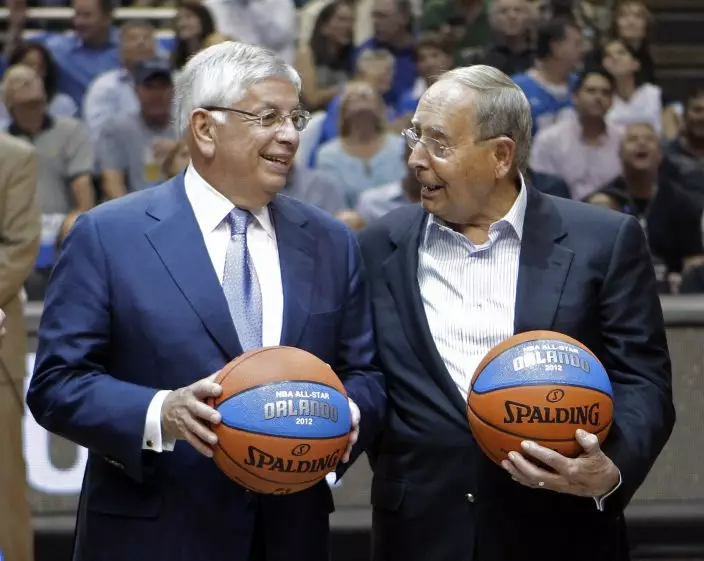 FILE - In this May 4, 2010, file photo, NBA commissioner David Stern, left, chats with Orlando Magic owner Rich DeVos during the first half of Game 1 in a second-round of the NBA basketball playoff series between the Magic and the Atlanta Hawks in Orlando, Fla. DeVos, the billionaire co-founder of direct-selling giant Amway and father-in-law of Education Secretary Betsy DeVos, died Thursday, Sept. 6, 2018. He was 92. (AP PhotoJohn Raoux, File)