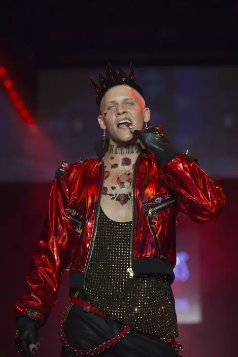 Designer Phillipe Blond models during the presentation of the Blonds spring 2019 collection with a Disney villains theme during Fashion Week Friday, Sept. 7, 2018, in New York. (AP PhotoKevin Hagen)