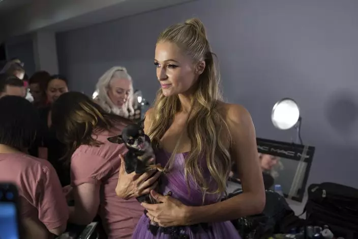 Model Paris Hilton prepares backstage for the presentation of The Blonds spring 2019 collection during Fashion Week Friday, Sept. 7, 2018, in New York. (AP PhotoKevin Hagen)