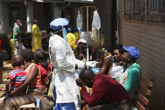 A health worker attends to patients suffering from cholera symptoms at a local hospital in Harare, Tuesday, Sept, 11, 2018. A cholera emergency has been declared in Zimbabwe's capital after 20 people have died, the health minister said Tuesday. (AP PhotoTsvangirayi Mukwazhi)