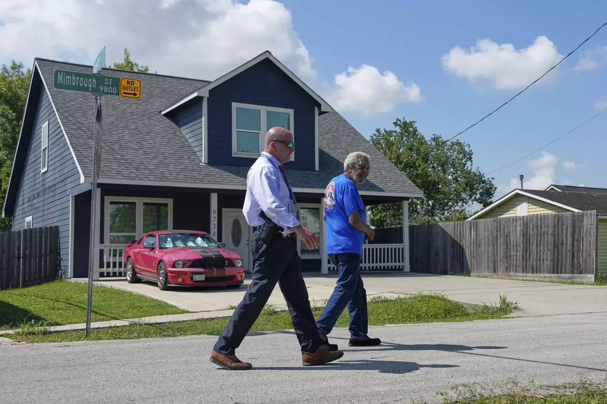 Neighbor George Skinner, right, talks a police investigator outside a home Tuesday, Sept. 2, 2025, in Houston, near the location where 11-year-old Julian Guzman was shot and killed during a doorbell prank, according to police. (AP Photo/David J. Phillip)