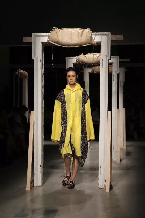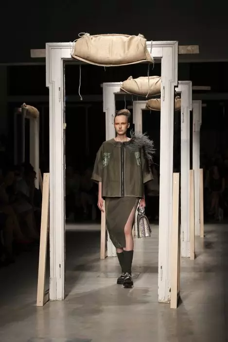Marras mixed masculine textiles, like camouflage and denim, with feminine laces, crochet work and animal prints. The garments are a patchwork, none with a clearly defined silhouette but with overlays indicating turbulence and forced journeys. Marras said he was telling the story of an Ethiopian princess who was forced under Italian rule into exile with her children on an island near Sardinia.