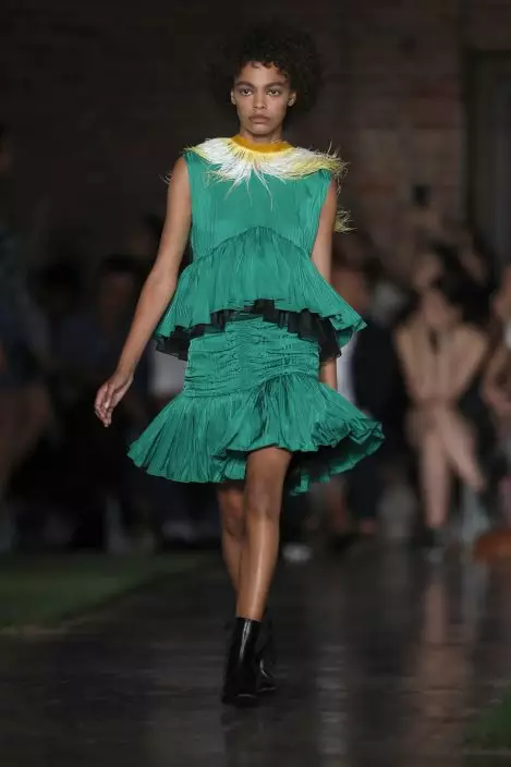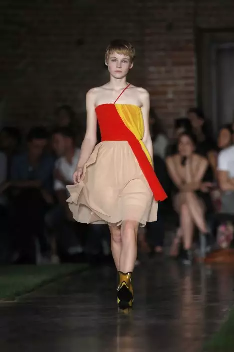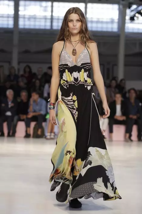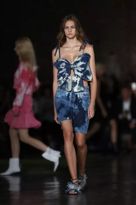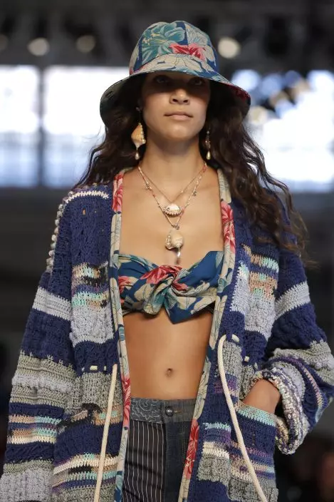 The looks have a contemporary edge that comes through in the silhouette, in particular a pagoda-tiered dress with a surfer's wetsuit bodice trimmed in ruffles. Relaxed patchwork denim looks with knitwear jackets and bikini tops played nicely against floral kimono tops with matching trousers.