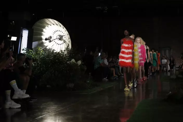 Models wear creations as part of the MSGM women's 2019 Spring-Summer collection, unveiled during the Fashion Week in Milan, Italy, Friday, Sept. 21, 2018. (AP PhotoAntonio Calanni)