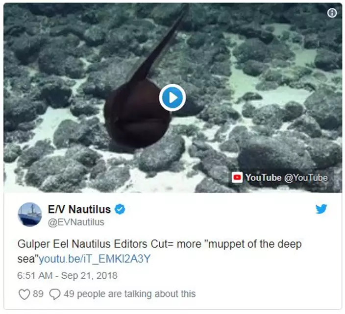 Also known as a pelican eel due to its stretchable mouth, the fish was filmed 1,425 metres (4,675ft) below the surface by a remotely operated vehicle from the Ocean Exploration Trust (OET).
