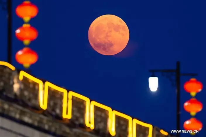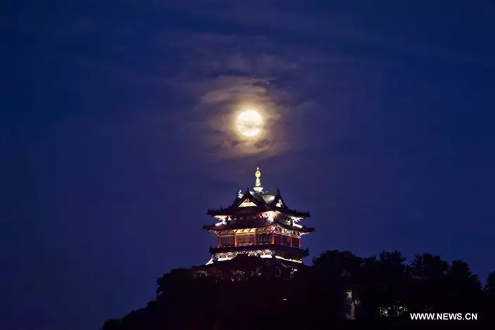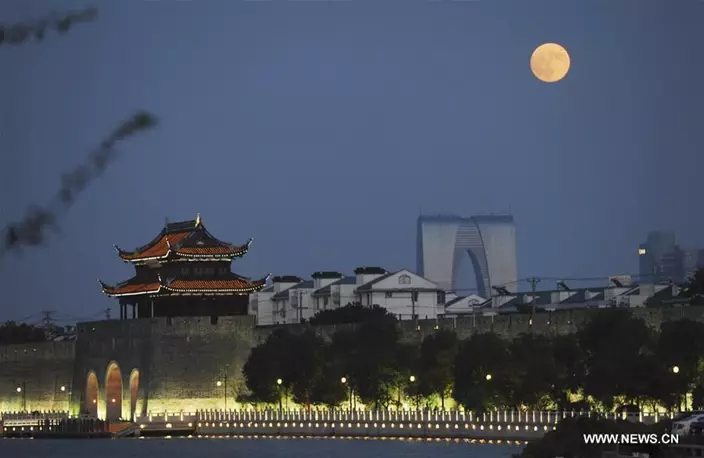 Photo taken on Sept. 24, 2018 shows the full moon over a section of ancient city walls initially built in Ming Dynasty (1368-1644) in Nanjing, capital of east China's Jiangsu Province.
