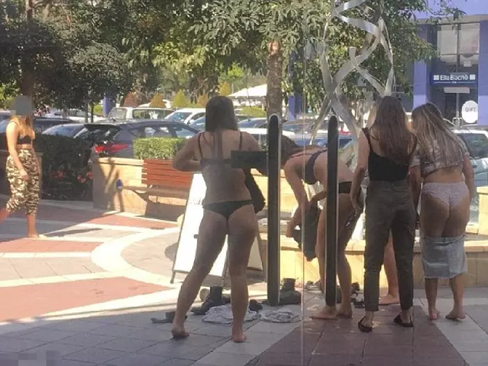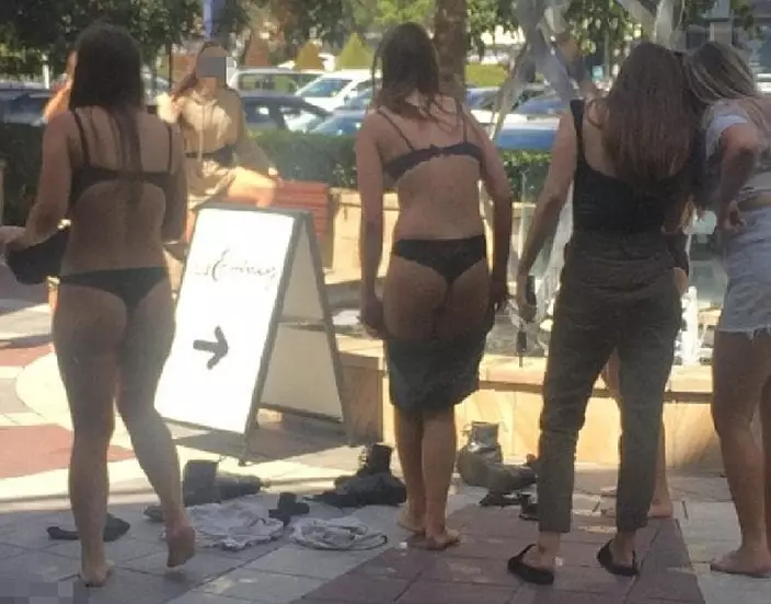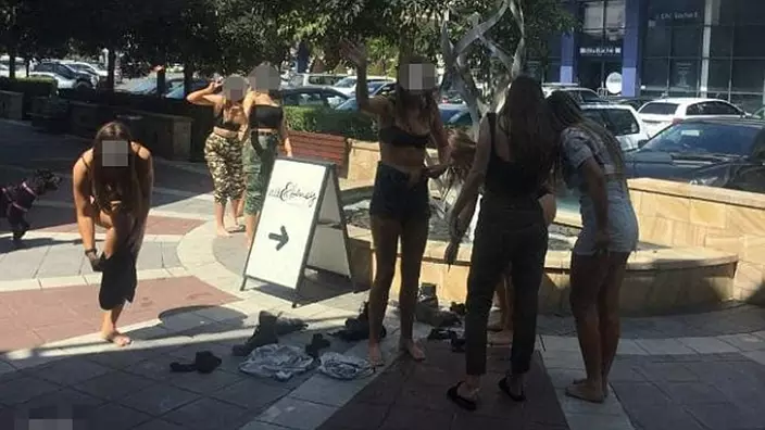 According to reports, the group of seven female students, from Erina High School, gathered in the crowded Fountain Plaza at around 12:45 in the afternoon. They stripped off their clothes piece by piece, with one other them even taking off her bar and dancing in the fountain.