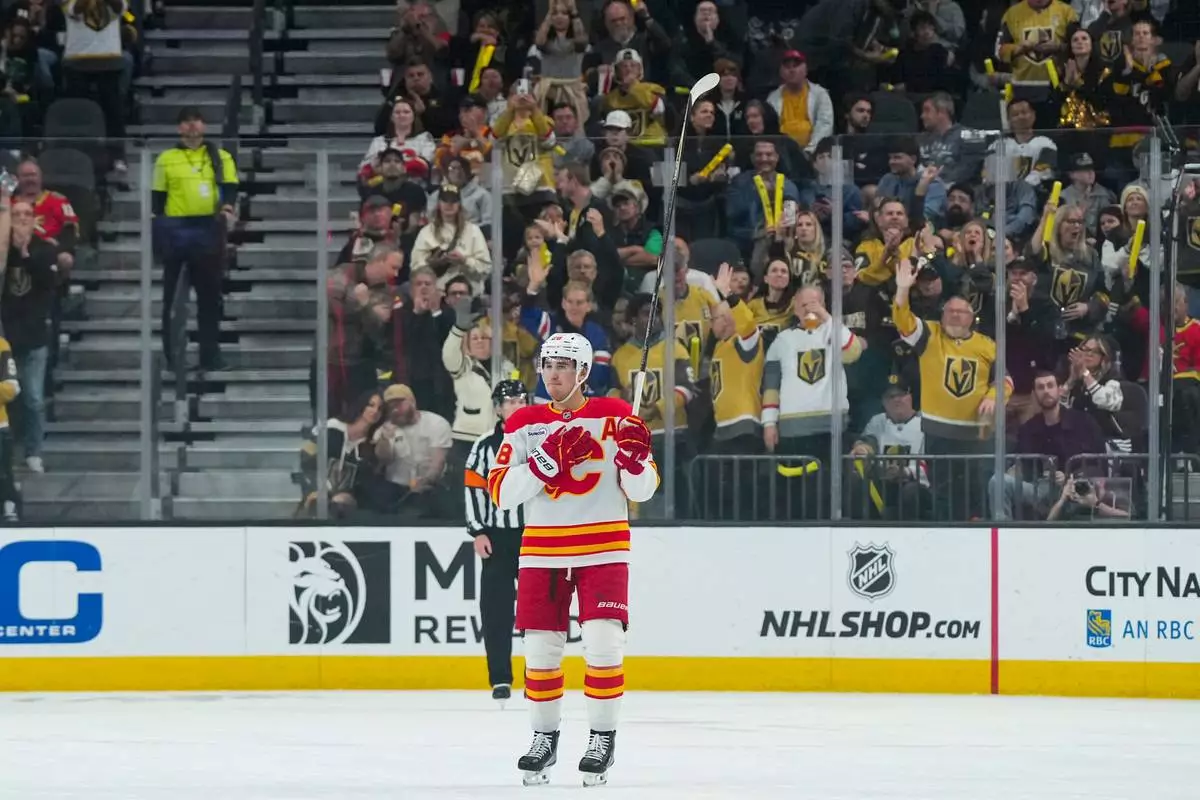 Calgary Flames defenseman Zach Whitecloud, center, salutes the fans during the first period of an NHL hockey game against the Vegas Golden Knights, Thursday, April 2, 2026, in Las Vegas. (AP Photo/Candice Ward)
