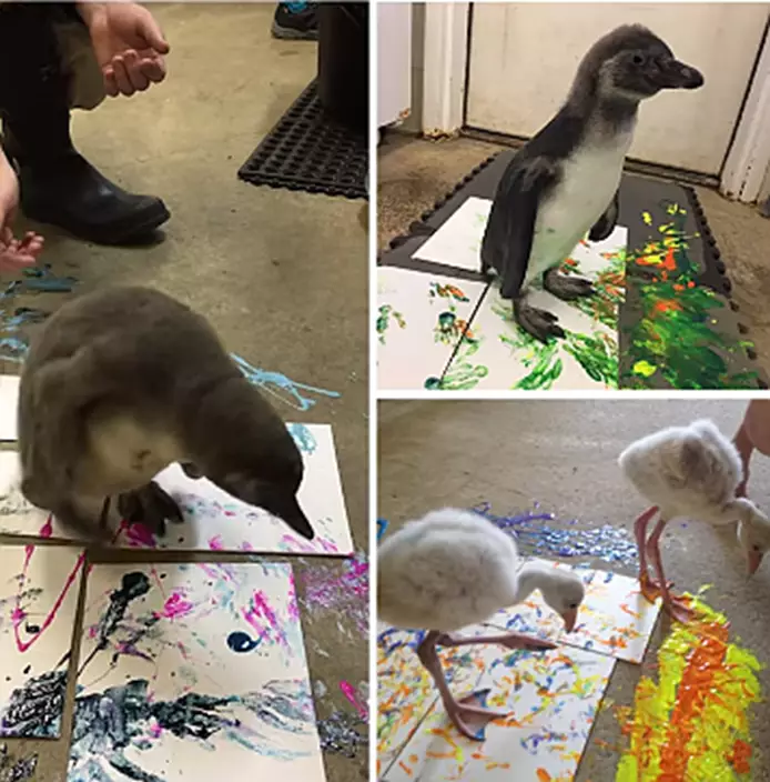 Think you need hands to paint a work of art? Think again, as baby birds try their hand at some zoo crafting.