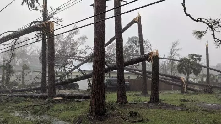 Pine trees litter a yard in Port St. Joe, Fla., on Garrison Avenue on Wednesday, Oct. 10, 2018, after Hurricane Michael made landfall in the Florida Panhandle. Hurricane Michael formed off the coast of Cuba carrying major Category 4 landfall in the Florida Panhandle. Surge in the Big Bend area, along with catastrophic winds at 155mph. (Douglas R. CliffordThe Tampa Bay Times via AP)