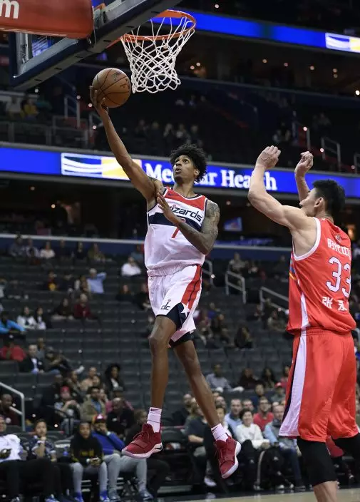 Washington Wizards forward Devin Robinson (7) goes to the basket past Guangzhou Long-Lions center Yongpeng Zhang (33) during the second half of an NBA exhibition basketball game Friday, Oct. 12, 2018, in Washington. (AP PhotoNick Wass)