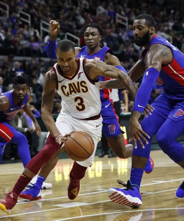 Cleveland Cavaliers guard George Hill (3) drives around Detroit Pistons center Andre Drummond during the second half of an NBA preseason basketball game, Friday, Oct. 12, 2018, in East Lansing, Mich. (AP PhotoCarlos Osorio)