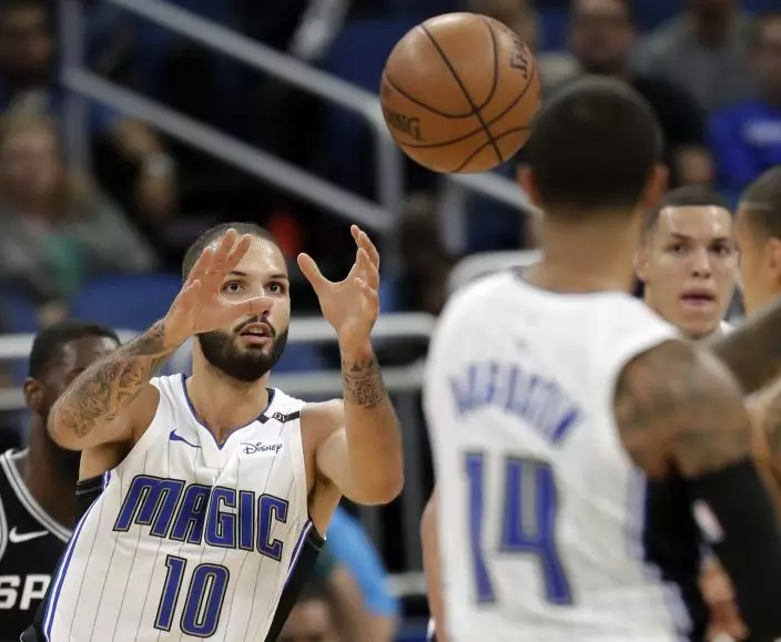 Orlando Magic's Evan Fournier (10) takes a pass from guard D.J. Augustin (14) during the second half of an NBA preseason basketball game against the San Antonio Spurs, Friday, Oct. 12, 2018, in Orlando, Fla. (AP PhotoJohn Raoux)