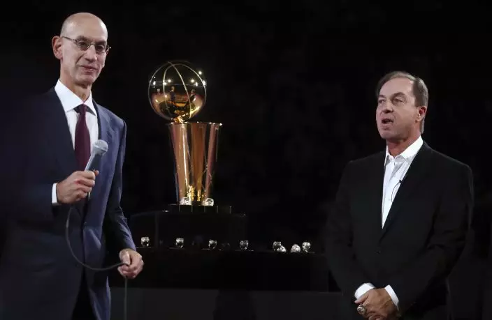 NBA commissioner Adam Silver, left, speaks next to Golden State Warriors co-owner Joe Lacob during an awards ceremony to recognize the team's NBA championship prior to a basketball game against the Oklahoma City Thunder, Tuesday, Oct. 16, 2018, in Oakland, Calif. (AP PhotoBen Margot)