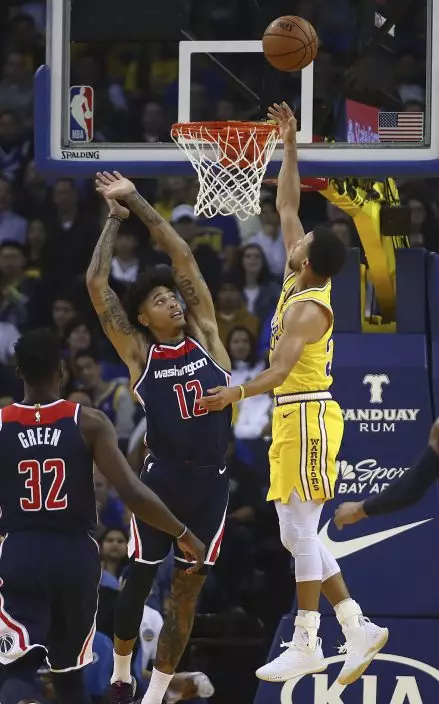 Golden State Warriors' Stephen Curry, right, lays up a shot over Washington Wizards' Kelly Oubre Jr. (12) during the first half of an NBA basketball game Wednesday, Oct. 24, 2018, in Oakland, Calif. (AP PhotoBen Margot)
