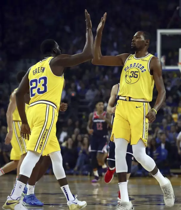 Golden State Warriors' Kevin Durant, right, celebrates a score against the Washington Wizards with Draymond Green (23) during the first half of an NBA basketball game, Wednesday, Oct. 24, 2018, in Oakland, Calif. (AP PhotoBen Margot)