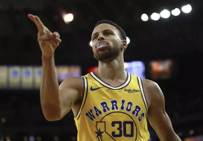 Golden State Warriors' Stephen Curry celebrates a score against the Washington Wizards during the first half of an NBA basketball game, Wednesday, Oct. 24, 2018, in Oakland, Calif. (AP PhotoBen Margot)