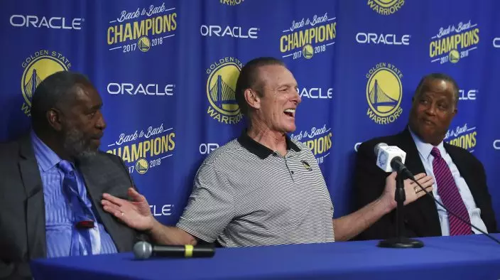 From left, members of the 1975 Warriors NBA Championship Team, Clifford Ray, Rick Barry and Jamaal Wilkes appear at a media conference prior to an NBA basketball game between the Warriors and Washington Wizards, Wednesday, Oct. 24, 2018, in Oakland, Calif. (AP PhotoBen Margot)