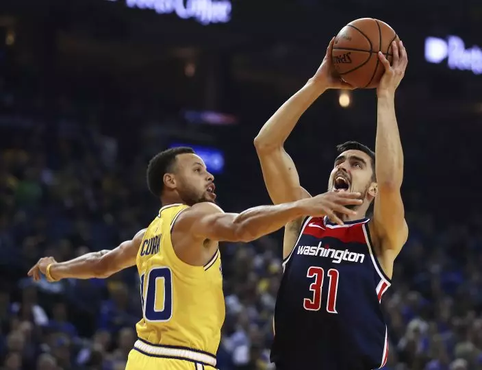 Washington Wizards' Tomas Satoransky, right, shoots against Golden State Warriors' Stephen Curry (30) during the first half of an NBA basketball game, Wednesday, Oct. 24, 2018, in Oakland, Calif. (AP PhotoBen Margot)