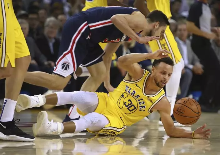 Golden State Warriors' Stephen Curry (30) recovers the ball in front of Washington Wizards' Tomas Satoransky during the first half of an NBA basketball game Wednesday, Oct. 24, 2018, in Oakland, Calif. (AP PhotoBen Margot)