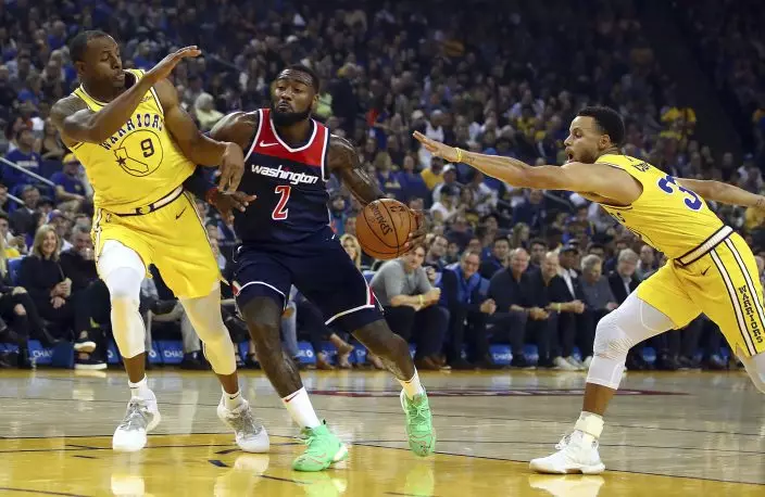 Washington Wizards' John Wall, center, drives the ball between Golden State Warriors' Andre Iguodala, left, and Stephen Curry (30) during the first half of an NBA basketball game Wednesday, Oct. 24, 2018, in Oakland, Calif. (AP PhotoBen Margot)