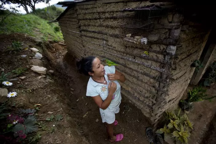 In this Oct. 10, 2018 photo, Carmen Martinez plays with her pet bird, a brown-throated Parakeet that was captured near her home in the coastal area of Carayaca on the outskirts of Caracas, Venezuela. The oil-rich nation was a pioneer in tropical ornithological research since the 18th century explorations of German scientist Alexander von Humboldt. (AP PhotoFernando Llano)