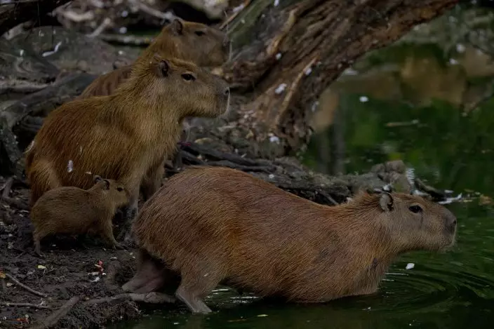 In this Oct. 18, 2018 photo, a group of Capybaras enter a lake at a private zoo where an investigation center to breed Venezuela's endangered red siskin bird is being built in Turmero, Venezuela. Online they go for more than $300, and demand remains high in Eastern Europe and Asia, scientists say. (AP PhotoFernando Llano)