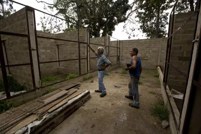 In this Oct. 18, 2018 photo, Federico Pantin, left, gives instructions to a worker at a new investigation center to breed Venezuela's endangered red siskin bird, at his private zoo in Turmero, Venezuela. Here, 200 birds are expected to be hatched next year, adding to the 25 caged at the Smithsonian Institution, forming a type of Noah's Ark to ensure that the iconic species does not disappear. (AP PhotoFernando Llano)