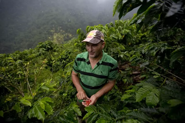In this Oct. 10, 2018 photo, farmer Simon Then shows red coffee beans he picked on his organic coffee farm in the coastal area of Carayaca on the outskirts of Caracas, Venezuela. No red siskins birds make this mountainside home yet, but Then envisions the terrain covered in dense forest as he and his neighbors join in the effort to restore the endangered bird. (AP PhotoFernando Llano)