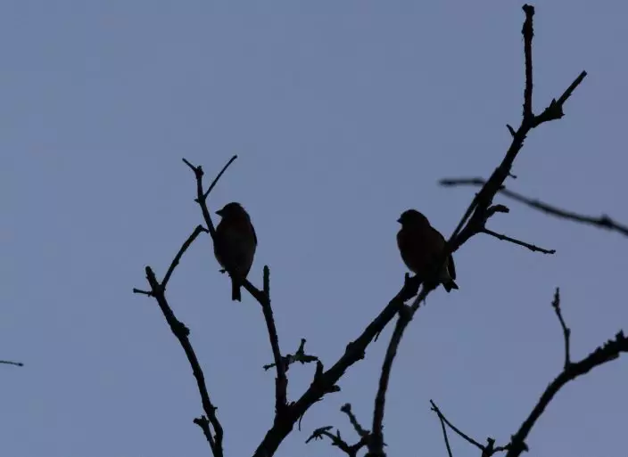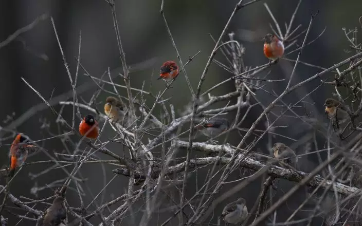 In this Oct. 23, 2018 photo, Venezuelan red siskin perch on branches in Vargas, Venezuela. Some 40 farmers in the rugged, coastal mountains of Carayaca, northwest of the capital Caracas, have stopped cutting down trees _ an important first step to creating a robust habitat for the threatened bird to thrive and repopulate.(AP PhotoFernando Llano)