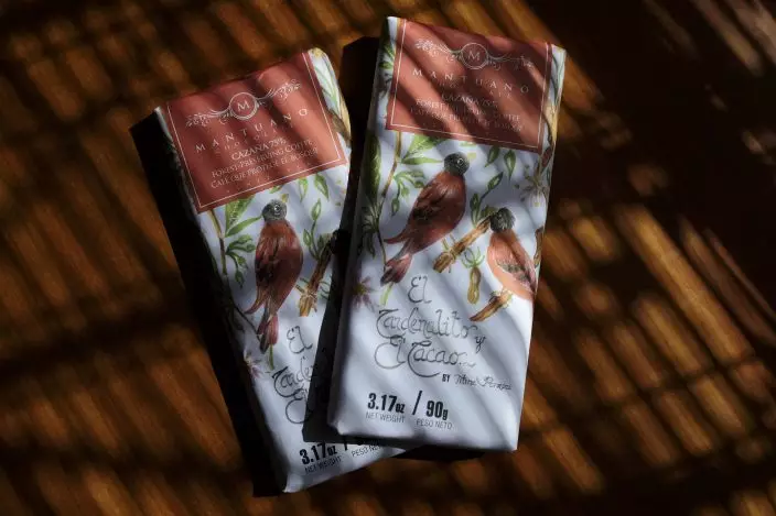 In this Oct. 20, 2018 photo, the wrapping of chocolate bars, brand "El Cardenalito and Cacao," is decorated with images of Venezuela's red siskin bird, and the message "Forest-Preserving Coffee," as part of a campaign to rescue the bird from extinction in Caracas, Venezuela. Farmers who meet The Red Siskin Initiative project's strict standards will win the right to market their coffee beans with "Bird Friendly" labels and take advantage of a loophole in Venezuelan law to set prices for premium products, sometimes five-times higher than price caps set by the socialist government. Eventually they hope to export the coffee. (AP PhotoFernando Llano)