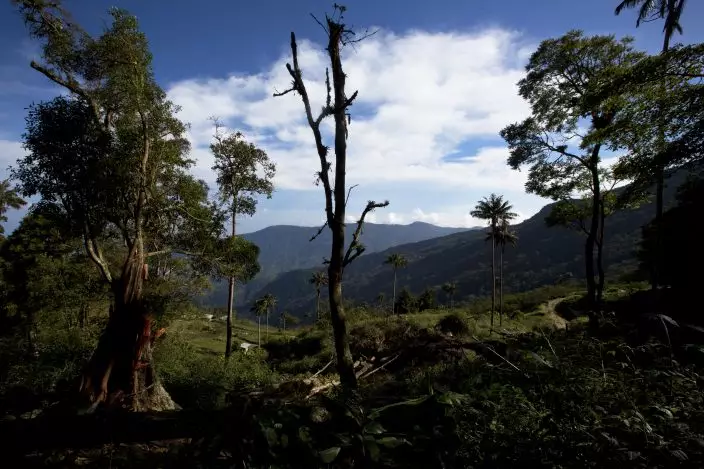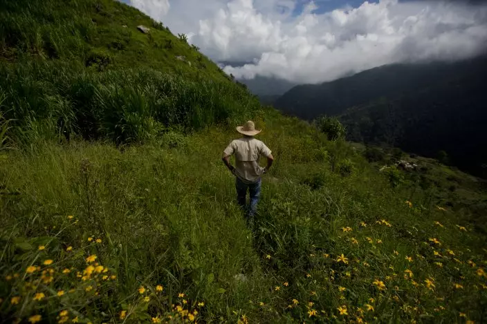 In this Oct. 10, 2018 photo, agronomist Luis Arrieta inspects a freshly planted coffee field that used to be a peach orchard in the coastal area of Carayaca on the outskirts of Caracas, Venezuela. Arrieta is part of The Red Siskin Initiative, which is trying to entice farmers into growing organic coffee groves with layers of thick branches to invite the endangered, perching finch-like red siskin birds. (AP PhotoFernando Llano)