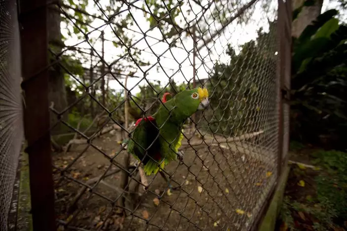 In this Oct. 18, 2018 photo, a yellow crowned macaw peers through its cage at a private zoo where an investigation center to breed Venezuela's red siskin bird is being built in Turmero, Venezuela. Poor Venezuelan families often capture and sell threatened birds to illegal traffickers, some in the military, adding to the challenges of rescuing endangered birds from extinction. (AP PhotoFernando Llano)