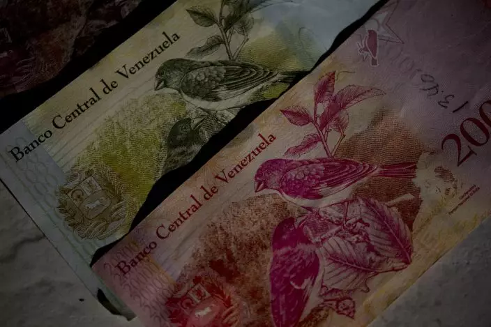 This Oct. 20, 2018 photo shows Bolivar bank notes decorated with images of Venezuela's red siskin bird, as part of rescue program in Caracas, Venezuela. Images of a tiny red bird that barely fills the palm of one's hand appear everywhere in Venezuela _ printed on money, labels of craft beer bottles and the cover of children's school books. (AP PhotoFernando Llano)