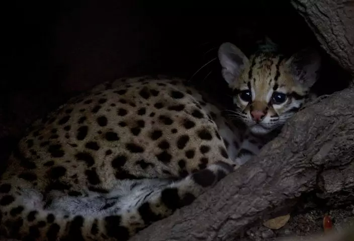 In this Oct. 18, 2018 photo, an ocelote cub hides inside a cave at a private zoo where an investigation center to breed Venezuela's red siskin bird is being built in Turmero, Venezuela. The Red Siskin Initiative launched about three years ago on a shoestring budget of less than $100,000 from the U.S. Fish and Wildlife Service and private groups in the U.S. and Venezuela. (AP PhotoFernando Llano)