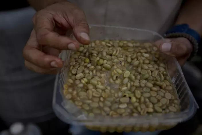 In this Oct. 10, 2018 photo, agronomist Luis Arrieta inspects coffee beans that are in the germination process, to be planted in fields where peaches are grown in the coastal area of Carayaca on the outskirts of Caracas, Venezuela. The threat of the finch-like red siskin vanishing from the wild has brought together an international team including scientists from the United States and Venezuelan coffee farmers set on rescuing it from extinction. (AP PhotoFernando Llano)