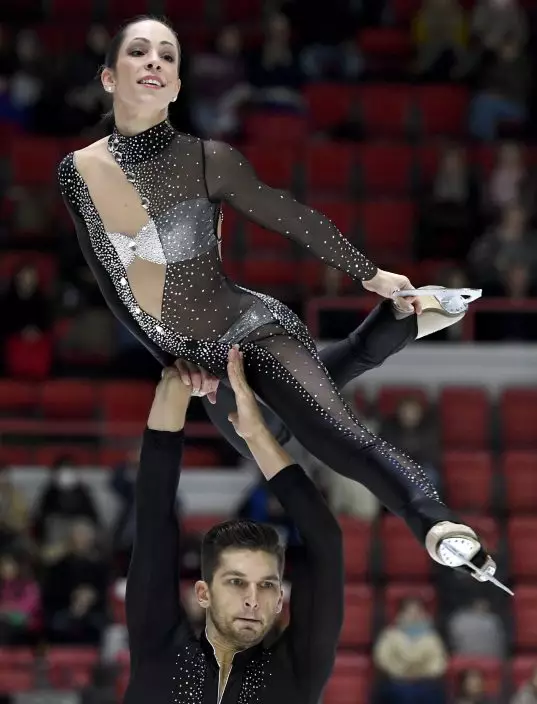 Natalia Zabiiako and Alexander Enbert were 0.6 points behind. The Russians outpointed their opponents on program components for their dramatic interpretation of Prokofiev's Alexander Nevski, but Enbert's fall on a triple toe loop put them behind technically.