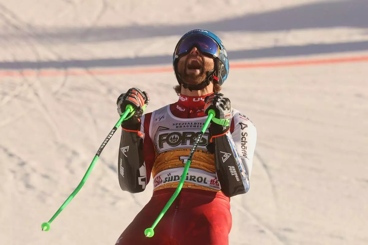 Austria's Marco Schwarz celebrates at the finish area of an alpine ski, men's World Cup Giant slalom, in Alta Badia, Italy, Sunday Dec. 21, 2025. (AP Photo/Alessandro Trovati)
