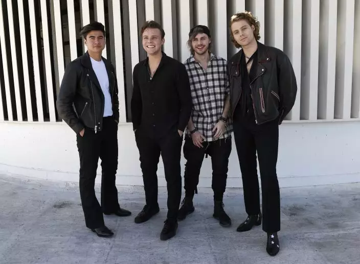 In this Oct. 18, 2018 photo, members of the band 5 Seconds of Summer, from left, Calum Hood, Ashton Irwin, Luke Hemmings and Michael Clifford pose at Capitol Records in Los Angeles to promote their third album "Youngblood." (Photo by Chris PizzelloInvisionAP)
