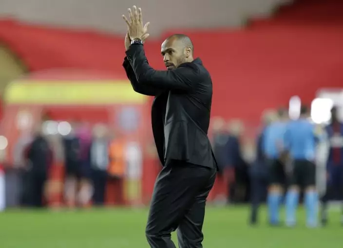 Monaco's coach Thierry Henry applauds the fans after the French League One soccer match between AS Monaco and Paris Saint-Germain at Stade Louis II in Monaco, Sunday, Nov. 11, 2018. PSG won the match 0-4. (AP PhotoClaude Paris)