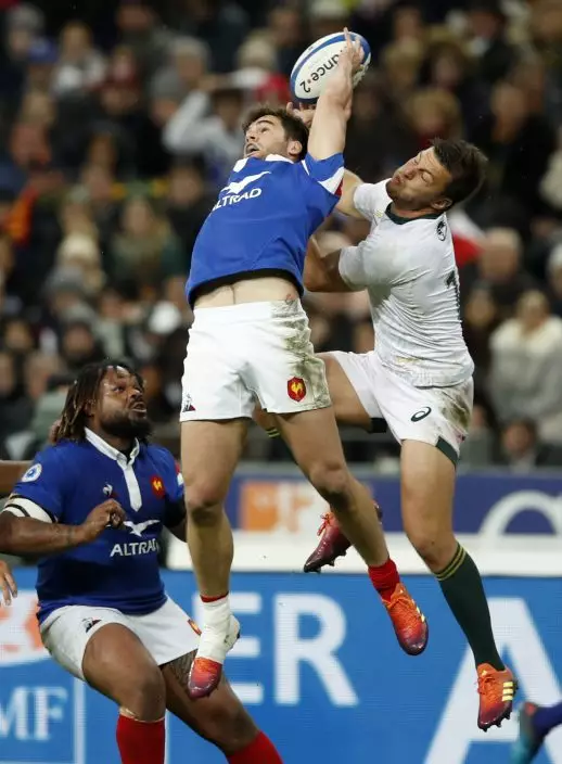 France's Damian Penaud and South Africa's Handre Pollard, right, leap to catch the ball during their rugby union international at the Stade de France in Paris, France, Saturday, Nov. 10, 2018. (AP PhotoChristophe Ena)