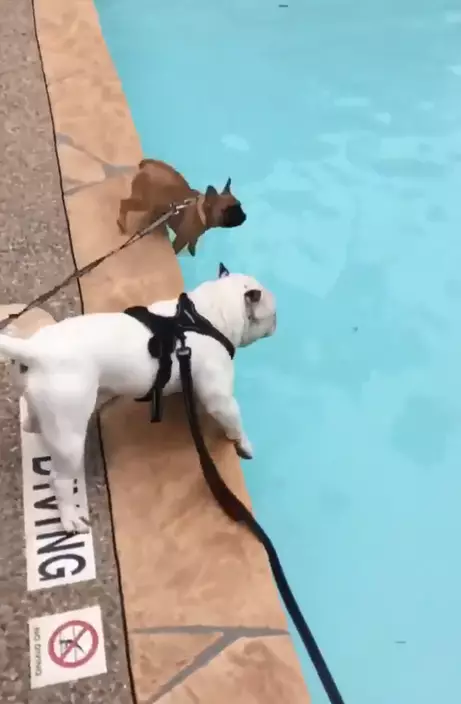 Puppies have a tendency to do the silliest things, and French bulldog Karma proved she’s no exception as she accidentally plunged into a swimming pool.