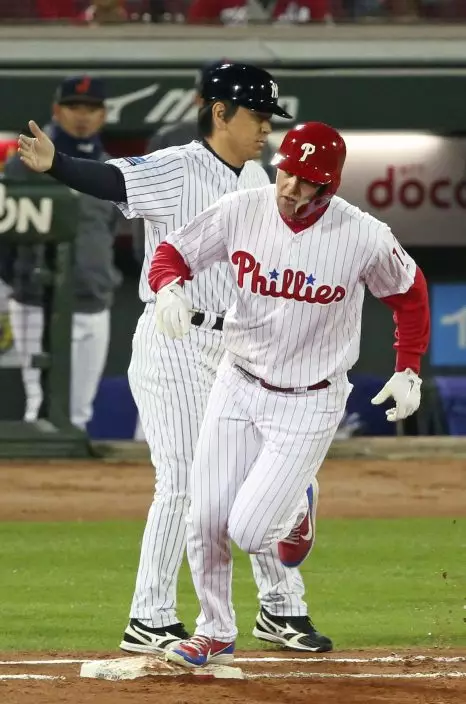 MLB All-Star designated hitter Rhys Hoskins of the Philadelphia Phillies celebrates with first base coach Hideki Matsui after hitting a solo home-run off All Japan starter Daichi Osera in the second inning of Game 4 at their All-Stars Series baseball at Mazda Zoom-Zoom Stadium in Hiroshima, western Japan, Tuesday, Nov. 13, 2018. (Kyodo News via AP)