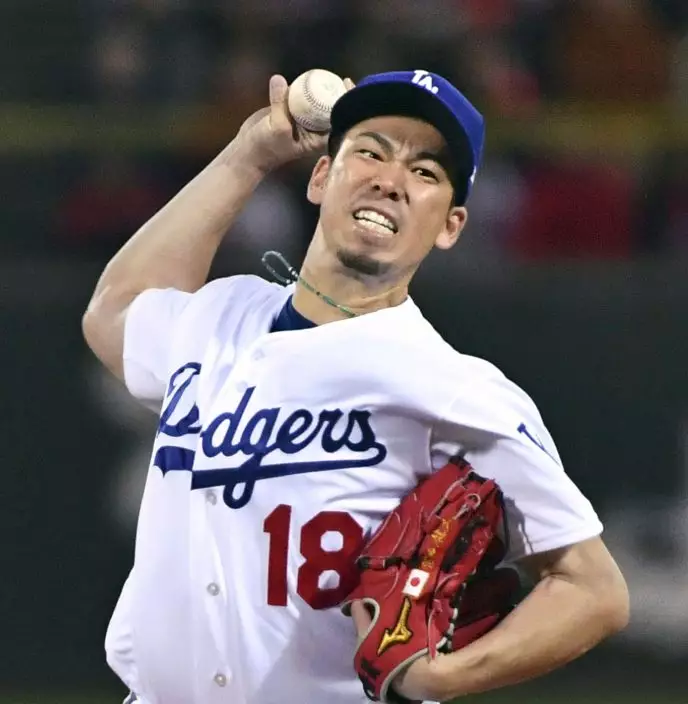 MLB All-Star starter Kenta Maeda of the Los Angeles Dodgers pitches against All Japan in the first inning of Game 4 of their All-Stars Series baseball at Mazda Zoom-Zoom Stadium in Hiroshima, western Japan, Tuesday, Nov. 13, 2018. (Kyodo News via AP)