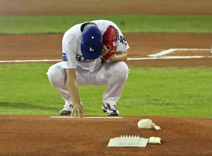 MLB All-Star starter Kenta Maeda of the Los Angeles Dodgers touches the mound before pitching against All Japan in Game 4 of their All-Stars Series baseball at Mazda Zoom-Zoom Stadium in Hiroshima, western Japan, Tuesday, Nov. 13, 2018. The stadium is Maeda's former home when he was playing for the Hiroshima Carp. (Kyodo News via AP)